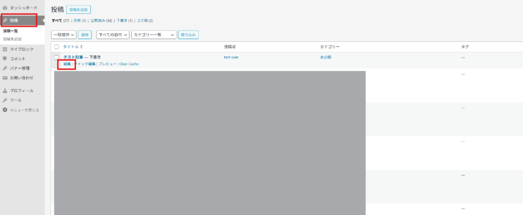 投稿画面にAIライター様が投稿した記事が表示されていますので、少し見づらいですが赤枠の編集をクリックしてください。