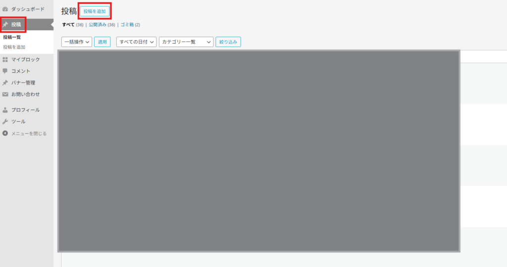 左サイド赤枠の「投稿」より「投稿を追加」をクリックします。