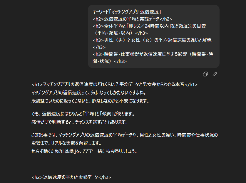 チャット内でお渡ししたキーワードと構成案を、そのままGPTsのプロンプト入力欄に貼り付けて出力します。
