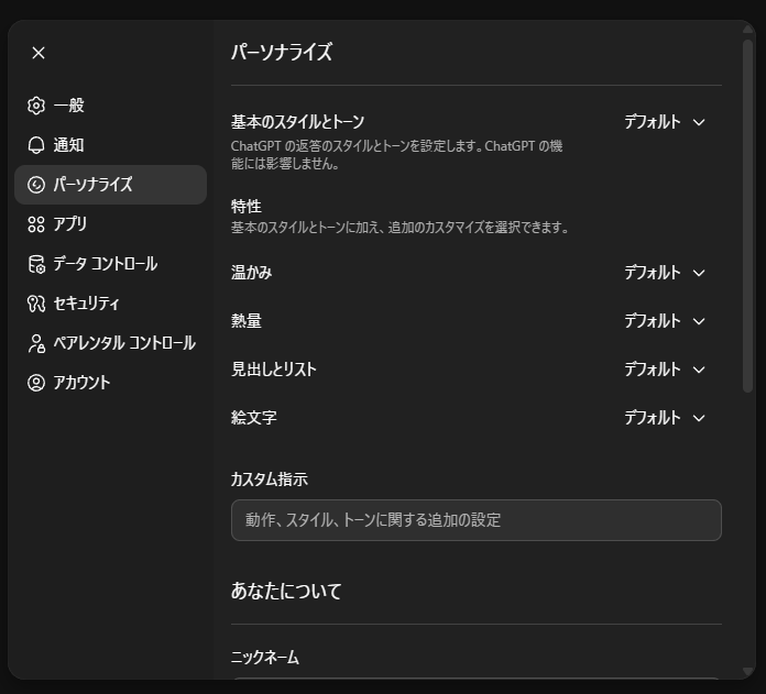 このため、万一パーソナライズがオンになっていると、当方のGPTsの指示が上書き出力されてしまいます。